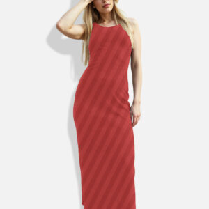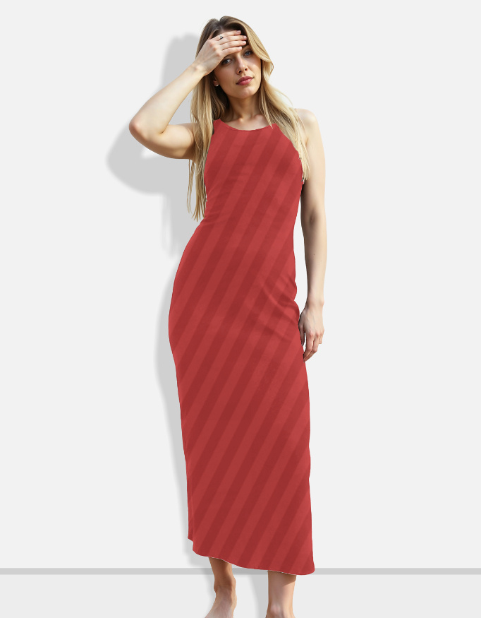 Command attention in this powerful Bodycon Maxi Dress. The design features a striking All-Over Print (AOP) of continuous diagonal stripes in a rich, bold red hue. Crafted from high-quality 220 GSM poly-spandex (assumed), the fabric ensures the vibrant print is displayed perfectly while smoothing and contouring your figure flawlessly. This is the definition of effortless, confident evening wear.
